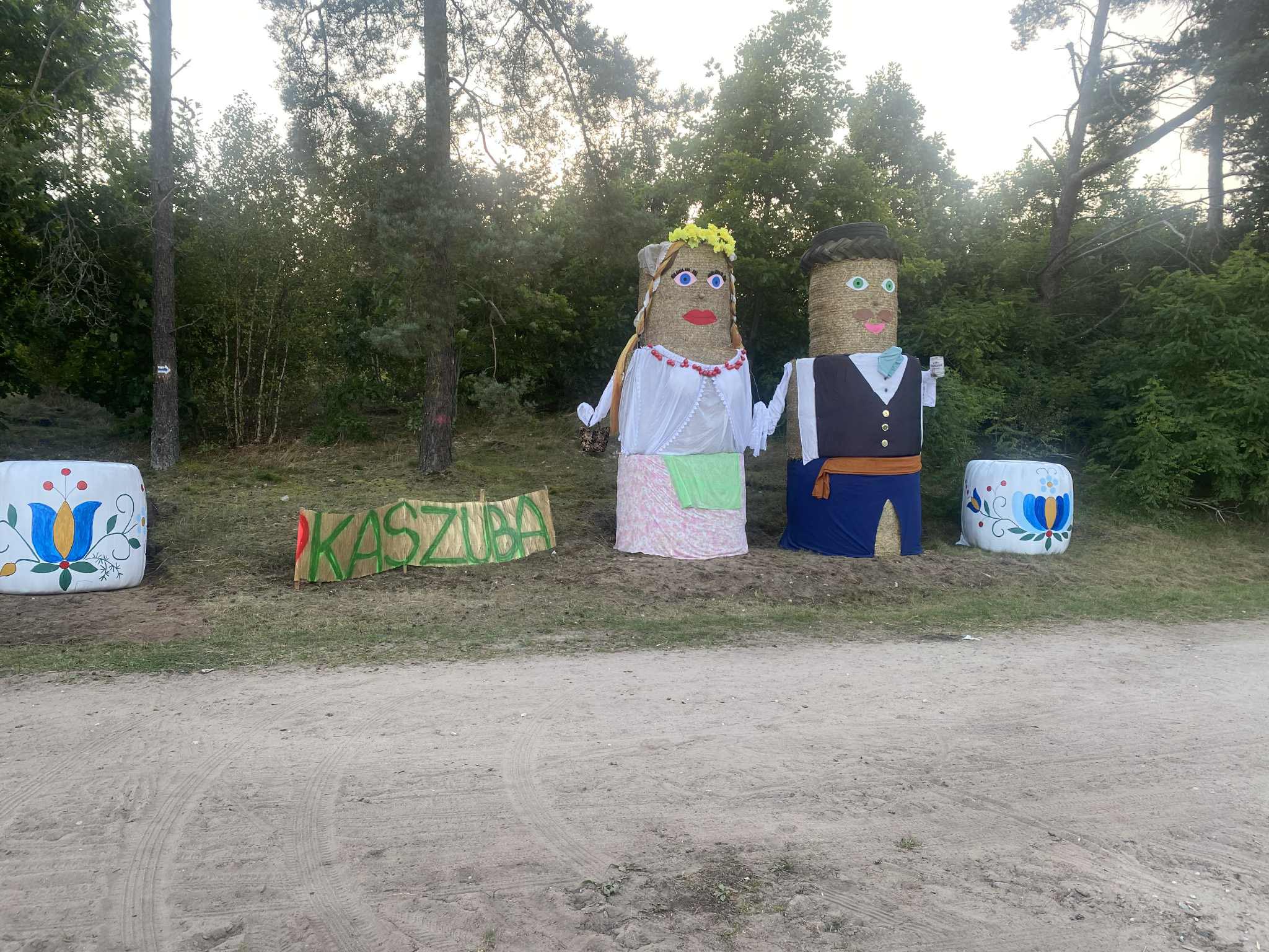 Tak pięknie prezentują się nasze kaszubskie postacie zrobione z bel słomy – ubrane w tradycyjne stroje, z uśmiechem witają wszystkich gości . Obok nich widnieją kolorowe kaszubskie wzory oraz dumny napis KASZUBA . To symbol gościnności, tradycji i radości wspólnego świętowania . Wielkie podziękowania dla wszystkich, którzy włożyli serce w przygotowanie tego pięknego witacza! Dzięki Wam Kaszuba wita wszystkich z dumą i uśmiechem . Niech żyją Kaszëbë!