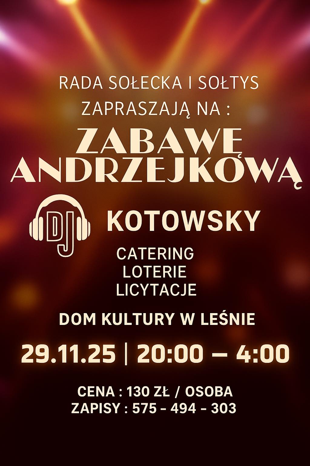 ZABAWA ANDRZEJKOWA 2025! Rada Sołecka i Sołtys serdecznie zapraszają wszystkich na wyjątkową Zabawę Andrzejkową, która odbędzie się w Domu Kultury w Leśnie! Dochód z licytacji sołectwo przekaże na https://www.mammoc.pl/marcin-peplinski – POMAGAJMY 29 listopada 2025 r. Godz. 20:00 – 4:00 DJ Kotowsky zadba o najlepszą muzykę przez całą noc! Catering, licytacje , loterie i mnóstwo świetnej zabawy gwarantowane! Cena: 130 zł / osoba Zapisy: 575 494 303 Nie przegap tej nocy pełnej tańca i dobrej energii! Zabierz znajomych i bawmy się razem do rana!