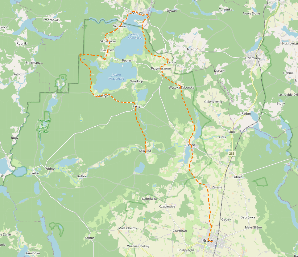Rodzaje szlaku: Szlak rowerowy (znakowany) i żółty. Miejscowości: BrusyDziemianyKaszubaKruszynLeśnoPrądzonkaPrzymuszewoSkoszewoSominyStudzieniceTrzebuńWindorpWysoka Zaborska, i Zalesie. Regiony: Bory Tucholskiebytowski (powiat)Chojnicki (powiat)kościerski (powiat)pomorskieRównina Charzykowska, i Zaborski Park Krajobrazowy. Województwa: pomorskie.